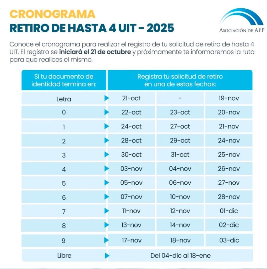 De acuerdo con la información difundida por la Asociación de AFP, el cronograma es el siguiente: